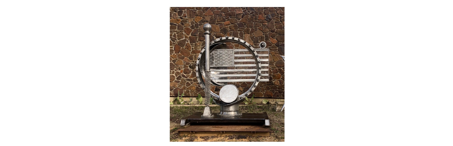 Using found and recycled materials, primarily made-in-America wrenches, drill bits, fans, and sprockets, Tobolowsky transforms industrial objects into powerful interpretations of the American flag, reflecting different moments in the nation’s history.