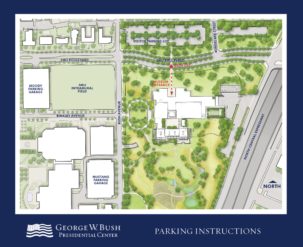 Visitors to the George W. Bush Presidential Center may park in the Bush Center parking lot located just north of the Bush Center. Parking is limited and available on a first-come, first-served basis. Visitors will be charged $10 per car for the first 4 hours and $1.00 for each additional 30 min. Visitors pay by credit card upon exiting the parking lot. Become a member today to receive discounted pricing on parking.
