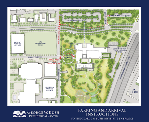 Using a ride-share service is highly encouraged. Drivers may drop off and pick up at the designated location on the map below. Please note the physical address of the Bush Institute is 6100 Bush Avenue, on the west side of the complex. The main Bush Museum entrance on SMU Boulevard will not be open.